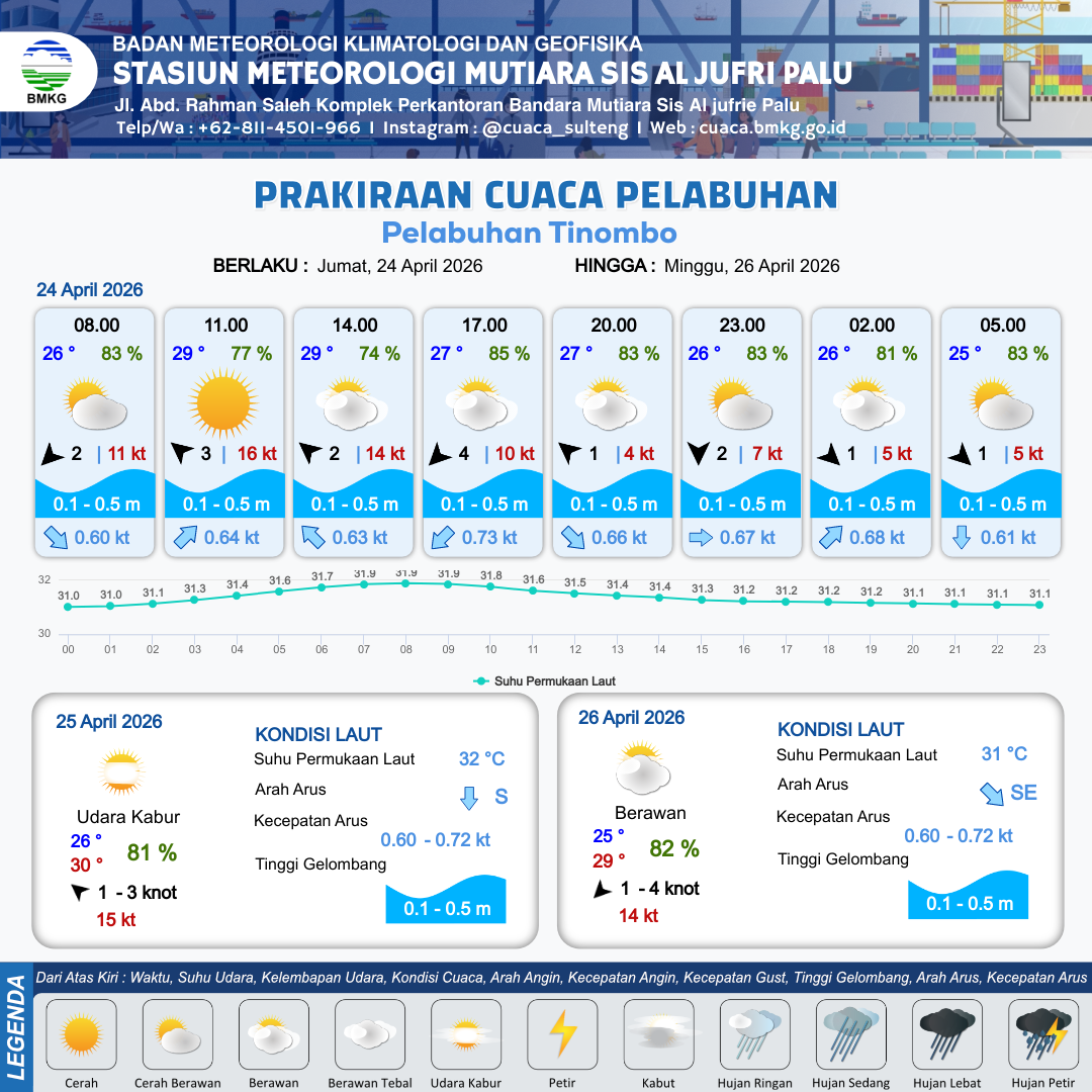 24 Apr 26, 12.00 4 jam kedepan | Tenggara 1 kt Gust Peningkatan kecepatan angin yang singkat dan tiba-tiba : 4 kt | 0.3 m Tenang | Barat Daya 0.7 Knot | 10 km | 27 °C | 83 % | -0.05 m | |