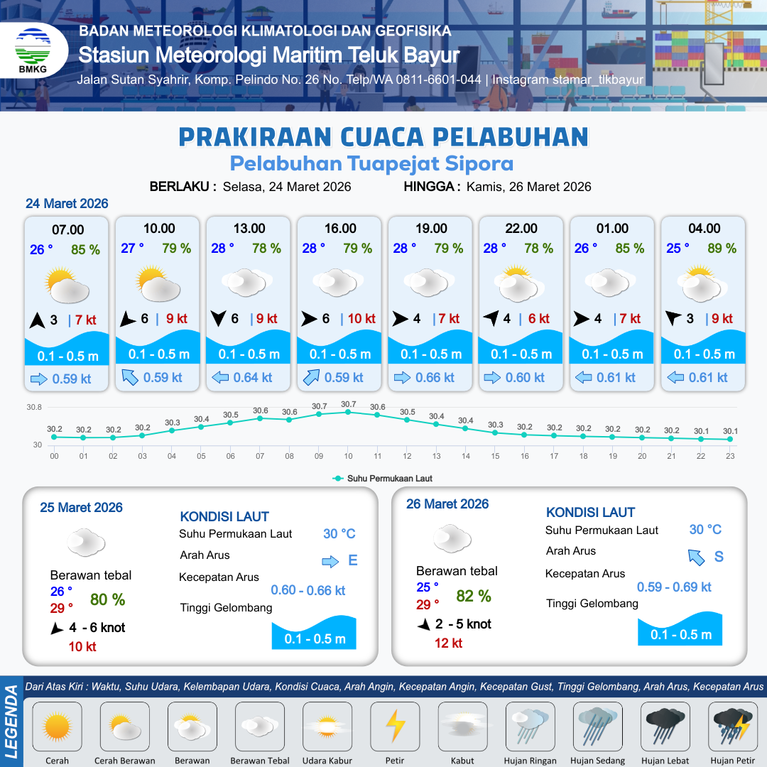 24 Mar 26, 12.00 12 jam kedepan | Barat Daya 4 kt Gust Peningkatan kecepatan angin yang singkat dan tiba-tiba : 8 kt | 0.1 m Tenang | Timur 0.6 Knot | 10 km | 27 °C | 84 % | -0.20 m | |