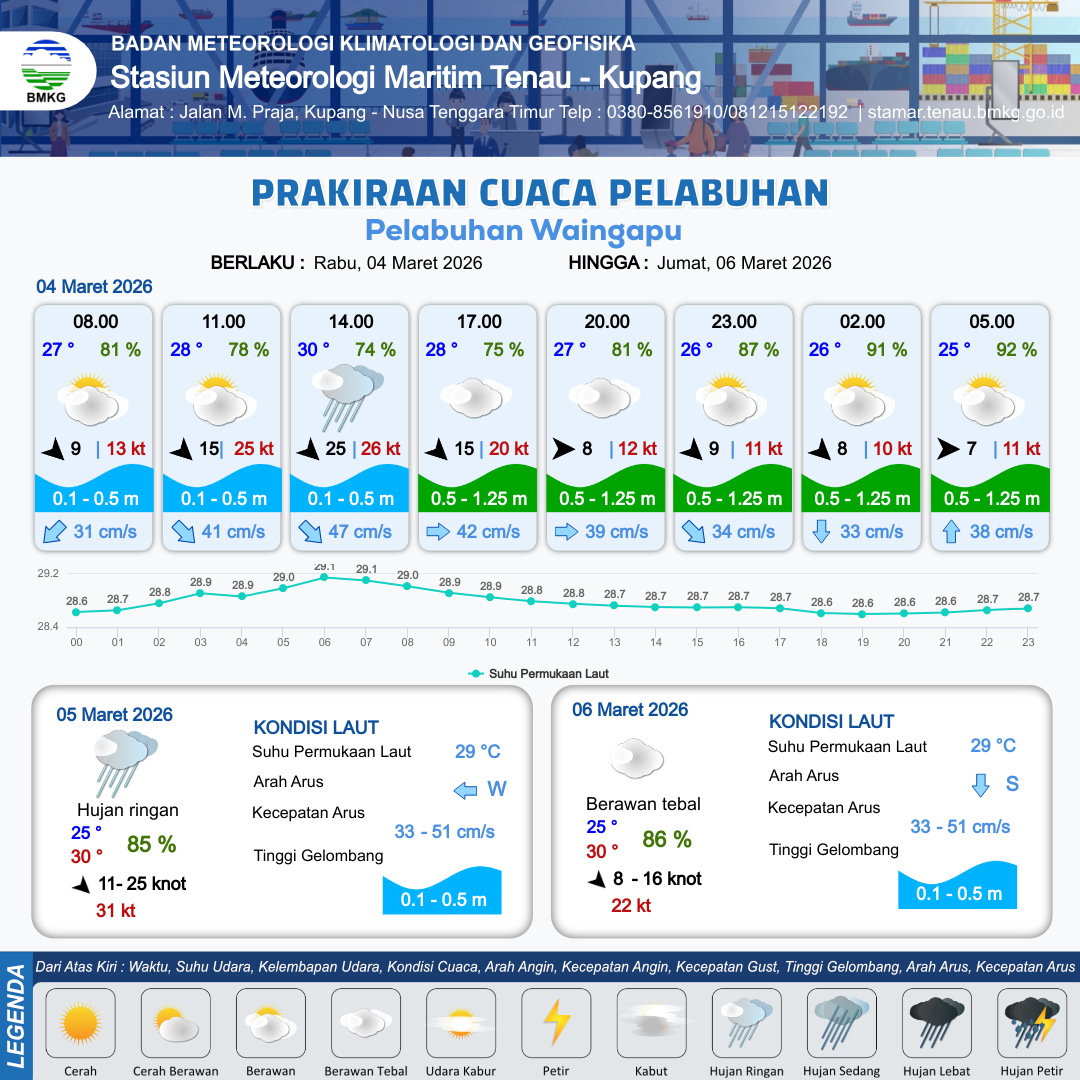 3 Mar 26, 10.00 10 jam yang lalu | Cerah Berawan | Barat 10 kt Gust Peningkatan kecepatan angin yang singkat dan tiba-tiba : 14 kt | | | 8 km | 29 °C | 74 % | -0.76 m |