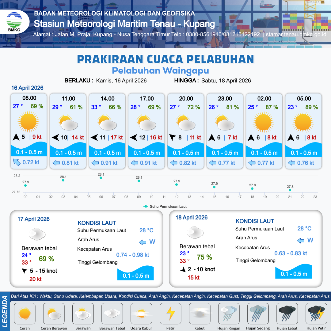16 Apr 26, 10.00 9 jam yang lalu | Cerah Berawan | Timur 12 kt Gust Peningkatan kecepatan angin yang singkat dan tiba-tiba : 15 kt | | | 10 km | 28 °C | 70 % | +0.50 m |