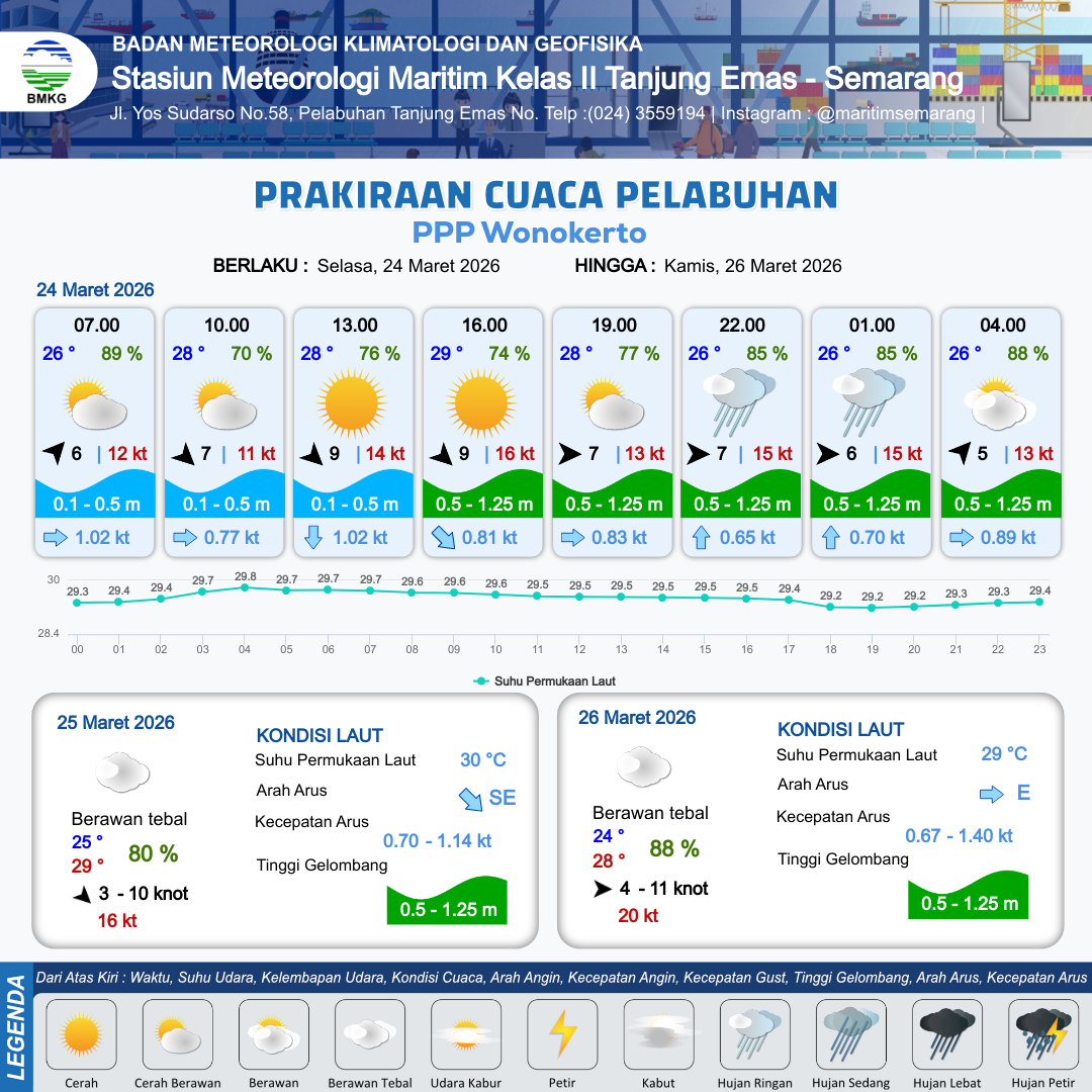 24 Mar 26, 10.00 10 jam kedepan | Barat Laut 9 kt Gust Peningkatan kecepatan angin yang singkat dan tiba-tiba : 15 kt | 0.9 m Rendah | Tenggara 0.9 Knot | 7 km | 29 °C | 74 % | +0.09 m | |