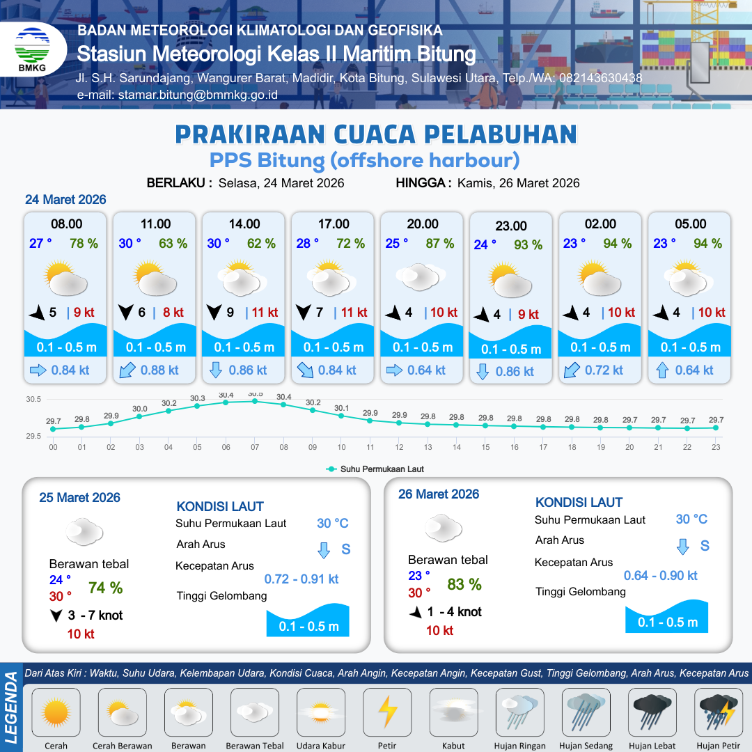 24 Mar 26, 06.00 6 jam kedepan | Utara 9 kt Gust Peningkatan kecepatan angin yang singkat dan tiba-tiba : 11 kt | 0.1 m Tenang | Selatan 0.9 Knot | 10 km | 30 °C | 62 % | -0.32 m | |