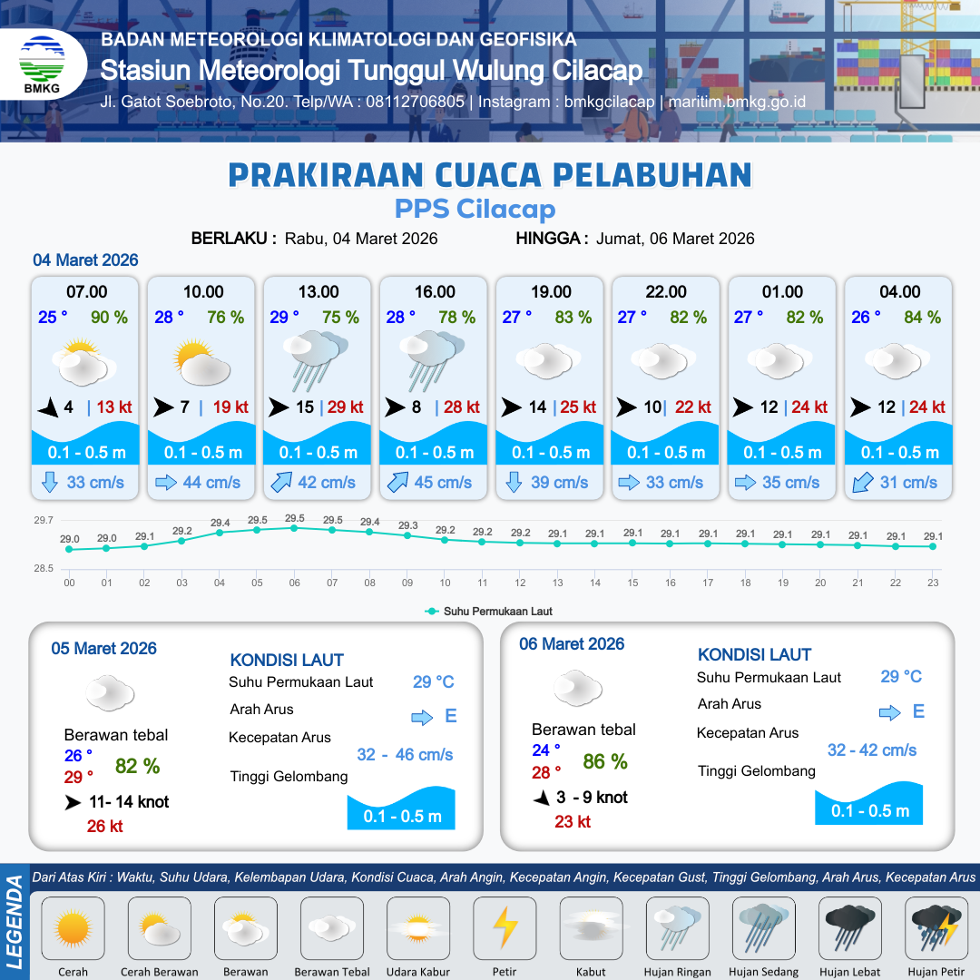 3 Mar 26, 05.00 15 jam yang lalu | Berawan Tebal | Barat Daya 10 kt Gust Peningkatan kecepatan angin yang singkat dan tiba-tiba : 9 kt | | | 10 km | 29 °C | 73 % | +0.05 m |