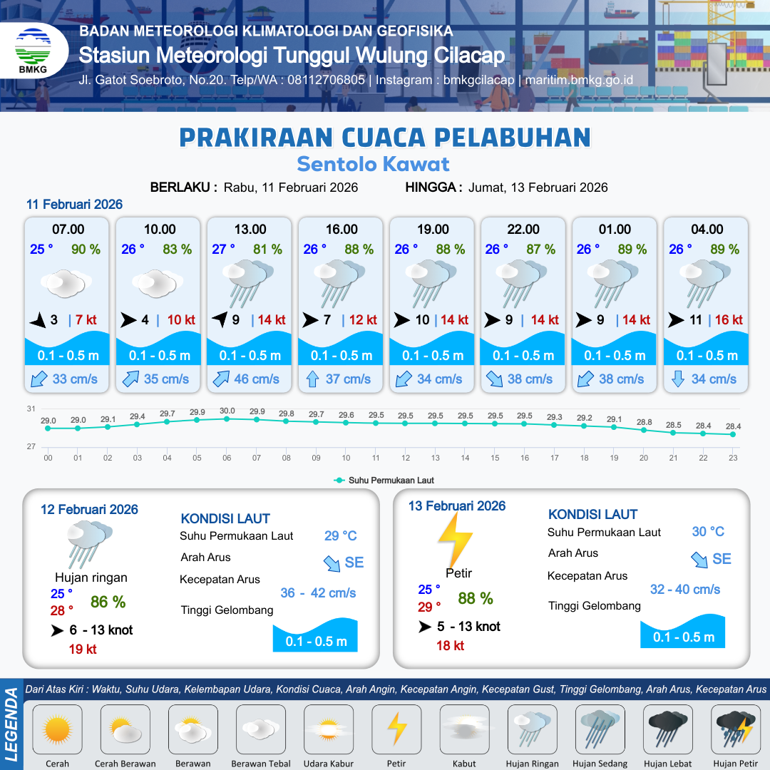 11 Feb 26, 18.00 2 jam kedepan | Barat 9 kt Gust Peningkatan kecepatan angin yang singkat dan tiba-tiba : 14 kt | 0.1 m Tenang | Barat Daya 38.0 cm/s | 6 km | 26 °C | 89 % | -0.35 m | |