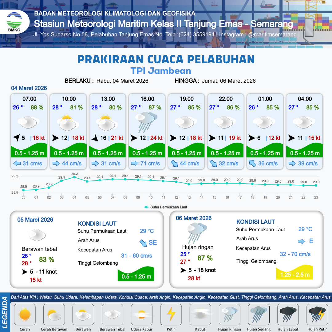 3 Mar 26, 06.00 14 jam yang lalu | Berawan Tebal | Barat 15 kt Gust Peningkatan kecepatan angin yang singkat dan tiba-tiba : 24 kt | | | 8 km | 28 °C | 80 % | -0.19 m |