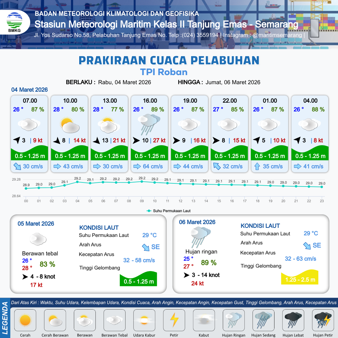 3 Mar 26, 23.00 3 jam kedepan | Berawan Tebal | Barat 6 kt Gust Peningkatan kecepatan angin yang singkat dan tiba-tiba : 13 kt | | | 8 km | 24 °C | 91 % | -0.36 m |
