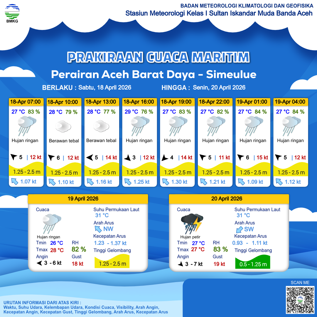 20 Apr 26, 09.00 3 jam kedepan | Barat Laut 6 kt Gust Peningkatan kecepatan angin yang singkat dan tiba-tiba : 13 kt | 1 m Rendah | Timur 1.0 Knots | 28 °C | 80 % | |