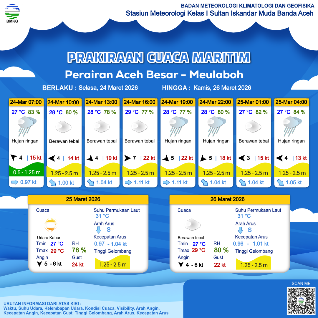 24 Mar 26, 02.00 2 jam kedepan | Timur 4 kt Gust Peningkatan kecepatan angin yang singkat dan tiba-tiba : 15 kt | 1.3 m Sedang | Timur 1.0 Knots | 27 °C | 81 % | |