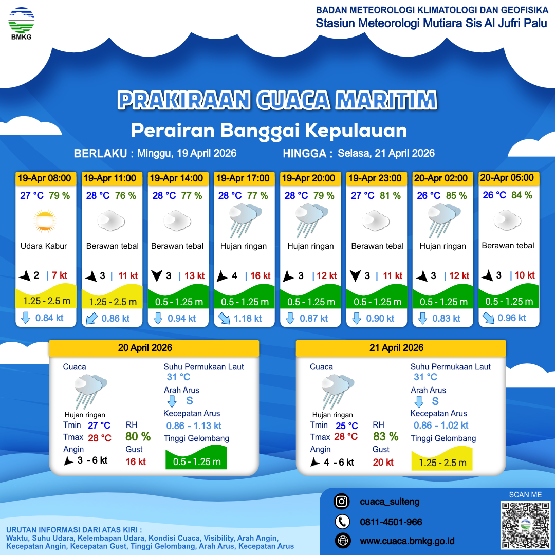 20 Apr 26, 09.00 3 jam kedepan | Timur Laut 5 kt Gust Peningkatan kecepatan angin yang singkat dan tiba-tiba : 15 kt | 1 m Rendah | Timur 1.1 Knots | 28 °C | 79 % | |