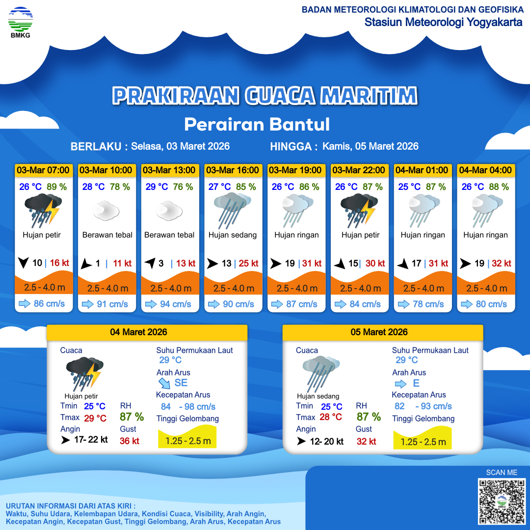 3 Mar 26, 13.00 15 jam kedepan | Barat 19 kt Gust Peningkatan kecepatan angin yang singkat dan tiba-tiba : 32 kt | 3 m Tinggi | Timur 90.0 cm/s | 26 °C | 87 % | |