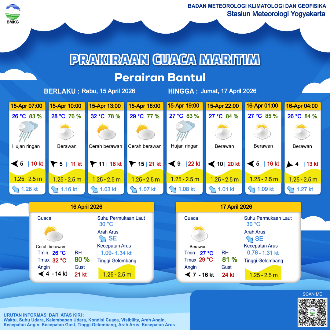 15 Apr 26, 11.00 3 jam kedepan | Timur 9 kt Gust Peningkatan kecepatan angin yang singkat dan tiba-tiba : 22 kt | 1.5 m Sedang | Tenggara 1.1 Knots | 28 °C | 80 % | |
