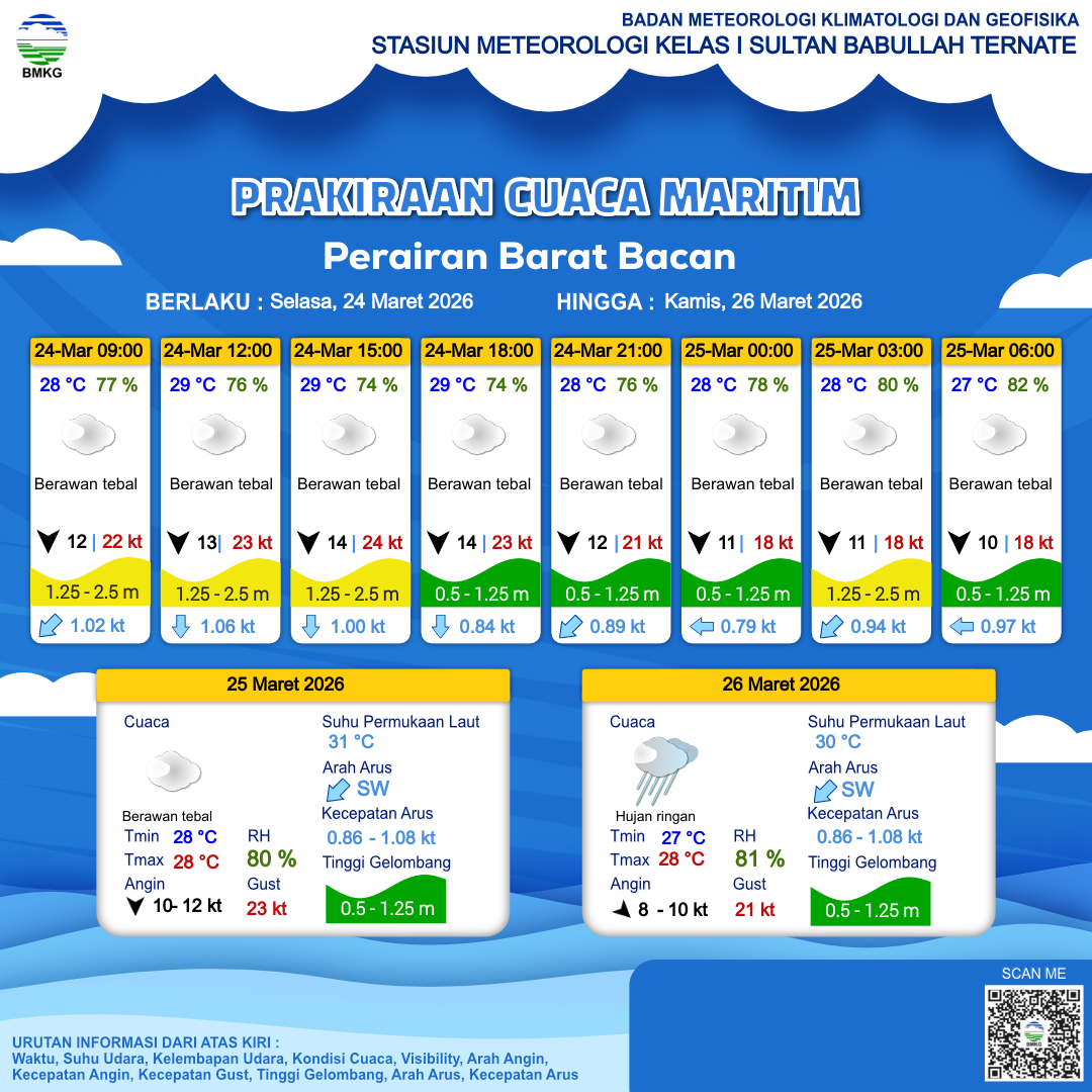 24 Mar 26, 09.00 9 jam kedepan | Utara 14 kt Gust Peningkatan kecepatan angin yang singkat dan tiba-tiba : 23 kt | 1.2 m Rendah | Selatan 0.8 Knots | 29 °C | 74 % | |