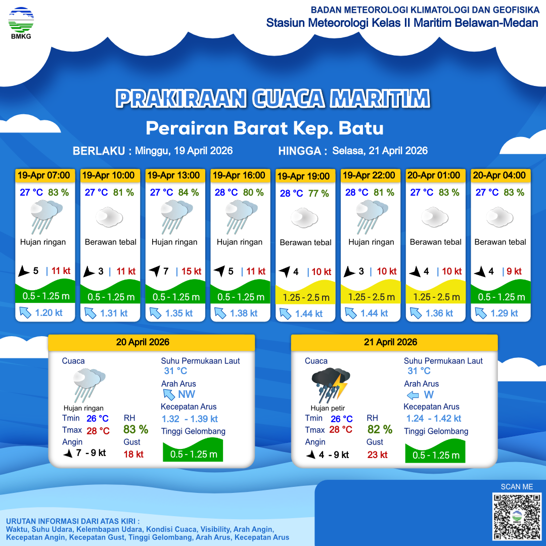 20 Apr 26, 12.00 6 jam kedepan | Barat 7 kt Gust Peningkatan kecepatan angin yang singkat dan tiba-tiba : 15 kt | 1.1 m Rendah | Barat 1.3 Knots | 27 °C | 83 % | |
