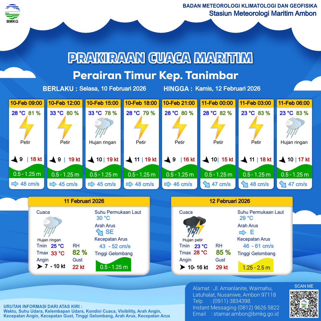 10 Feb 26, 22.00 5 jam kedepan | Hujan Ringan | Barat 10 kt Gust Peningkatan kecepatan angin yang singkat dan tiba-tiba : 18 kt | | | 25 °C | 83 % |