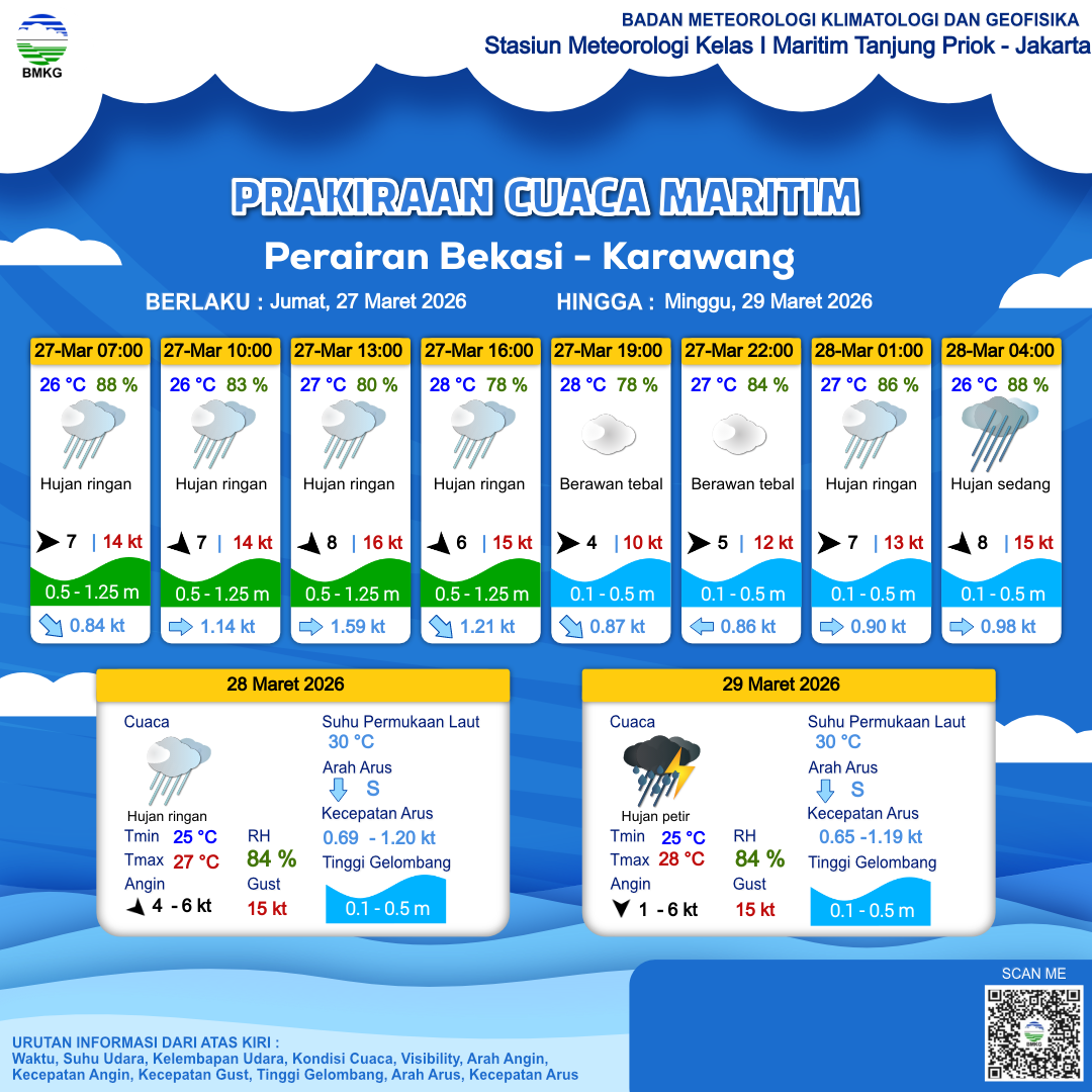 27 Mar 26, 13.00 5 jam kedepan | Barat 4 kt Gust Peningkatan kecepatan angin yang singkat dan tiba-tiba : 10 kt | 0.5 m Rendah | Barat 0.9 Knots | 28 °C | 80 % | |