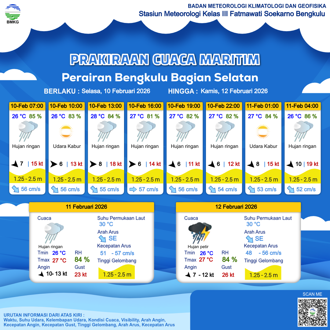10 Feb 26, 19.00 2 jam kedepan | Barat Laut 8 kt Gust Peningkatan kecepatan angin yang singkat dan tiba-tiba : 15 kt | 1.7 m Sedang | Tenggara 52.0 cm/s | 27 °C | 85 % | |