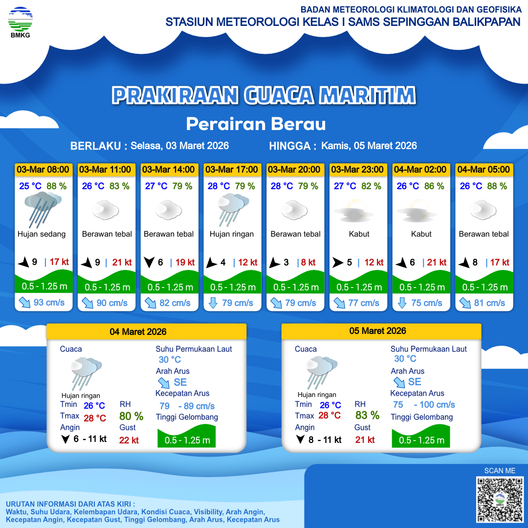 3 Mar 26, 16.00 18 jam kedepan | Barat 5 kt Gust Peningkatan kecepatan angin yang singkat dan tiba-tiba : 12 kt | 0.7 m Rendah | Tenggara 75.0 cm/s | 27 °C | 83 % | |