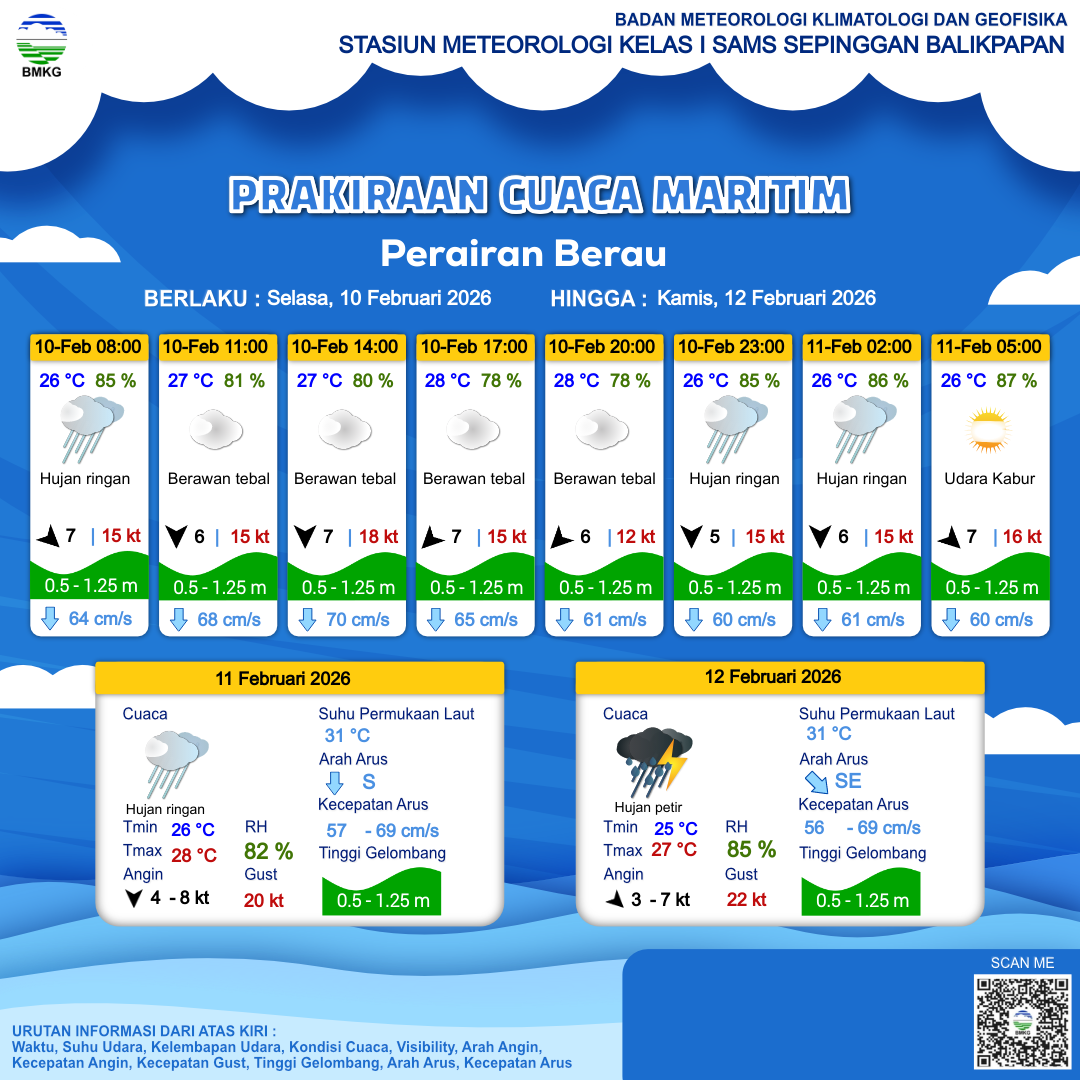 10 Feb 26, 20.00 4 jam kedepan | Barat Laut 7 kt Gust Peningkatan kecepatan angin yang singkat dan tiba-tiba : 17 kt | 0.8 m Rendah | Selatan 60.0 cm/s | 26 °C | 86 % | |
