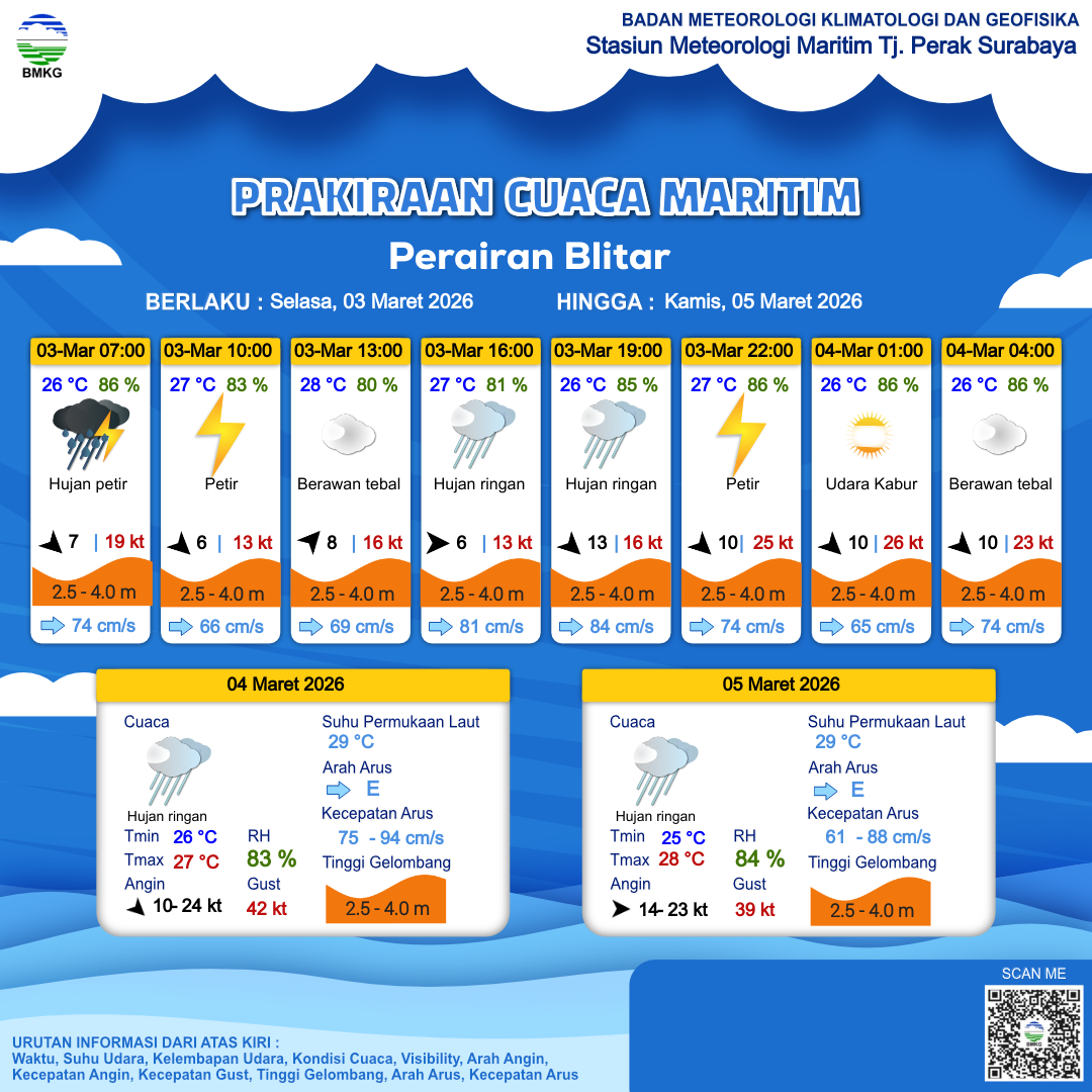 3 Mar 26, 06.00 8 jam kedepan | Barat Daya 8 kt Gust Peningkatan kecepatan angin yang singkat dan tiba-tiba : 16 kt | 3.2 m Tinggi | Timur 69.0 cm/s | 28 °C | 80 % | |