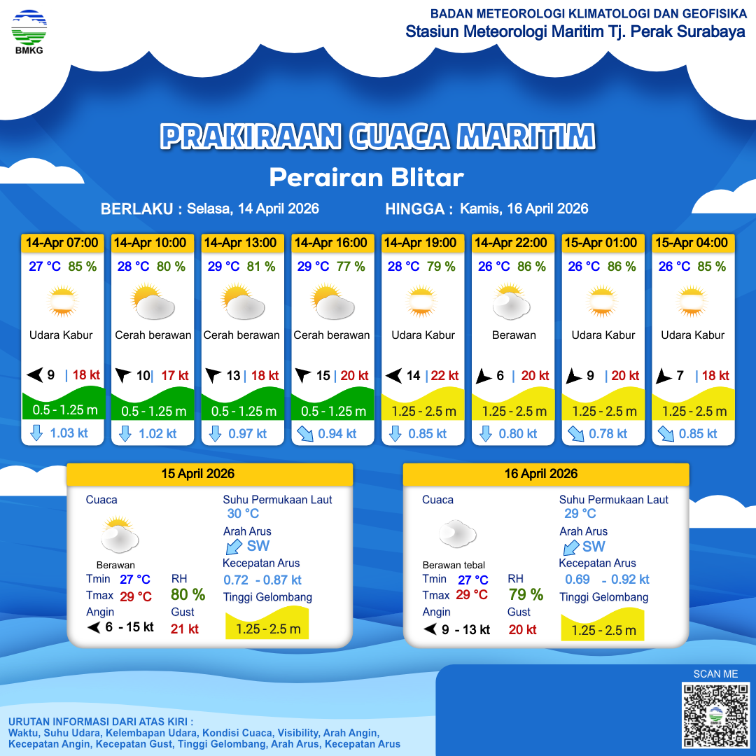 14 Apr 26, 16.00 4 jam kedepan | Timur Laut 6 kt Gust Peningkatan kecepatan angin yang singkat dan tiba-tiba : 18 kt | 1.3 m Sedang | Selatan 0.8 Knots | 26 °C | 86 % | |