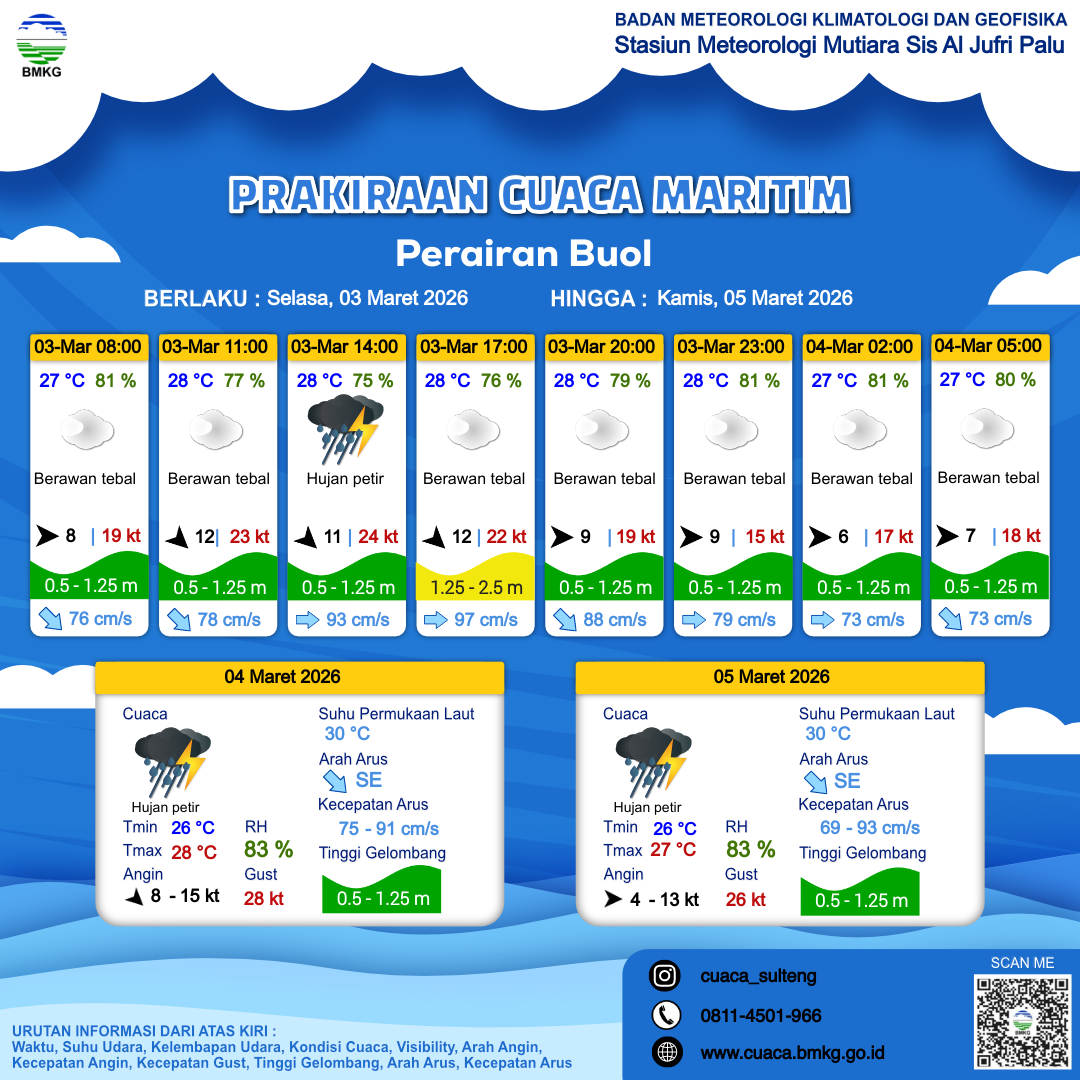 3 Mar 26, 14.00 16 jam kedepan | Barat 9 kt Gust Peningkatan kecepatan angin yang singkat dan tiba-tiba : 15 kt | 0.8 m Rendah | Timur 82.0 cm/s | 28 °C | 80 % | |