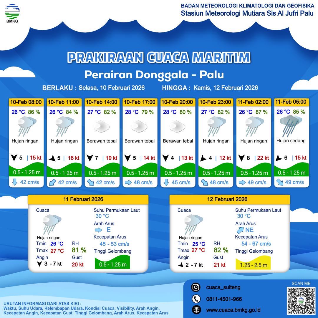 10 Feb 26, 21.00 4 jam kedepan | Timur Laut 6 kt Gust Peningkatan kecepatan angin yang singkat dan tiba-tiba : 15 kt | 0.9 m Rendah | Timur 56.0 cm/s | 26 °C | 86 % | |