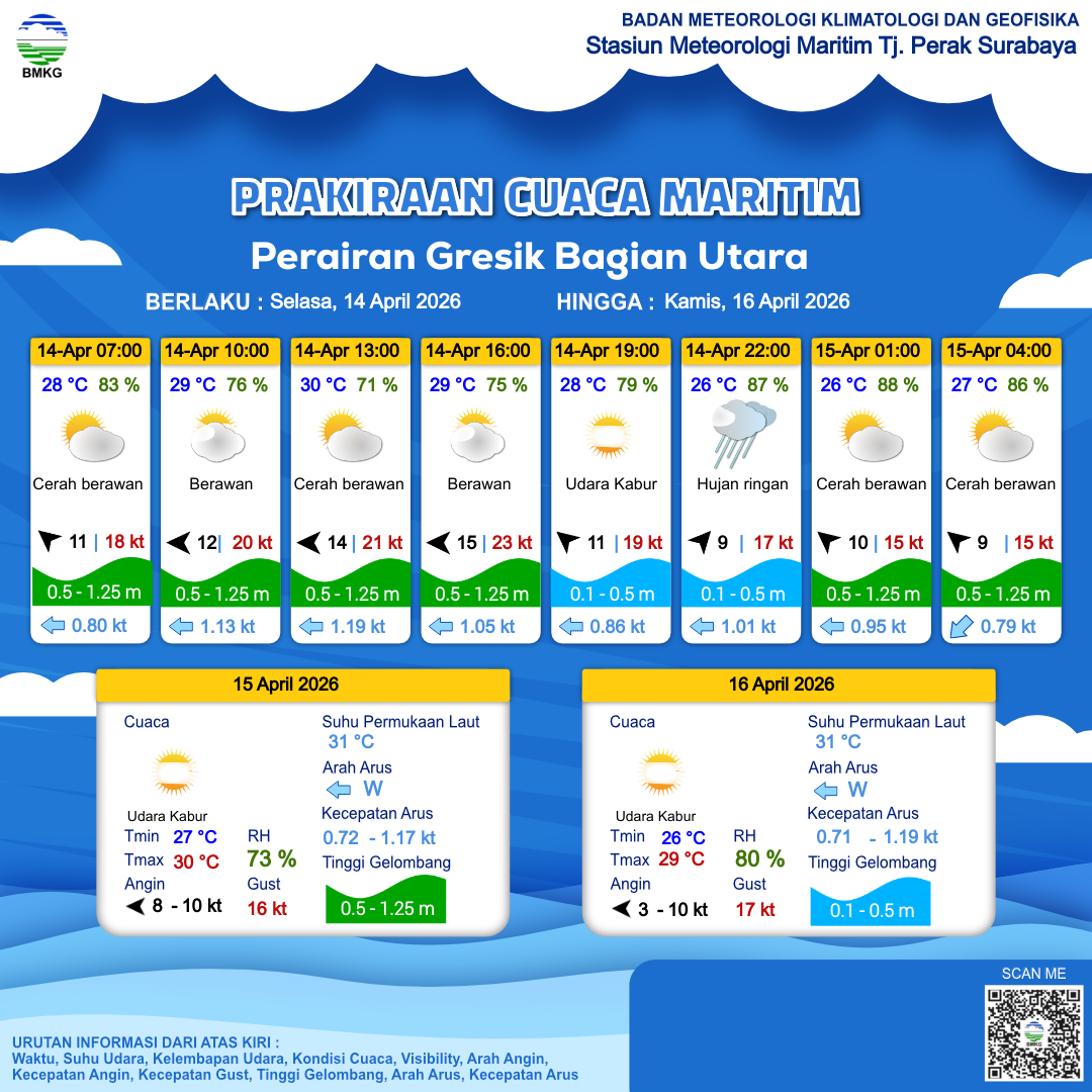 14 Apr 26, 14.00 2 jam kedepan | Barat Daya 9 kt Gust Peningkatan kecepatan angin yang singkat dan tiba-tiba : 17 kt | 0.5 m Rendah | Barat 1.0 Knots | 27 °C | 84 % | |