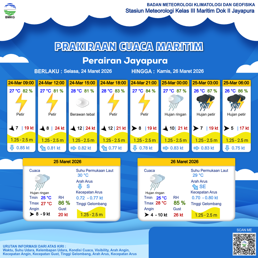 24 Mar 26, 22.00 22 jam kedepan | Barat 5 kt Gust Peningkatan kecepatan angin yang singkat dan tiba-tiba : 17 kt | 1.5 m Sedang | Selatan 0.8 Knots | 27 °C | 86 % | |