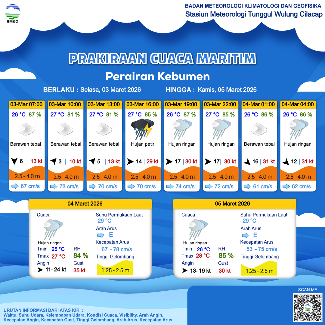 3 Mar 26, 08.00 10 jam kedepan | Barat 14 kt Gust Peningkatan kecepatan angin yang singkat dan tiba-tiba : 28 kt | 3.3 m Tinggi | Timur 69.0 cm/s | 26 °C | 86 % | |