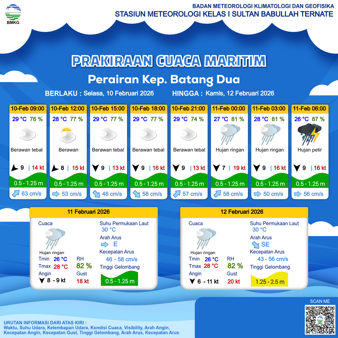 10 Feb 26, 20.00 3 jam kedepan | Utara 9 kt Gust Peningkatan kecepatan angin yang singkat dan tiba-tiba : 13 kt | 1.1 m Rendah | Timur 54.0 cm/s | 27 °C | 85 % | |