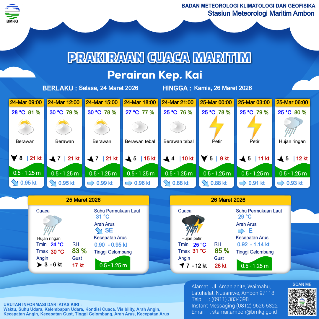 24 Mar 26, 18.00 18 jam kedepan | Barat Laut 5 kt Gust Peningkatan kecepatan angin yang singkat dan tiba-tiba : 11 kt | 0.8 m Rendah | Timur 0.9 Knots | 25 °C | 79 % | |