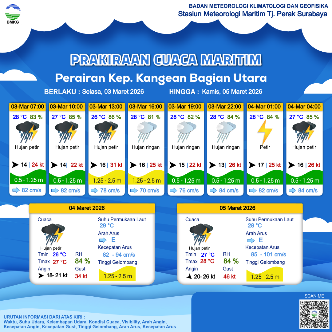 3 Mar 26, 05.00 7 jam kedepan | Barat 16 kt Gust Peningkatan kecepatan angin yang singkat dan tiba-tiba : 30 kt | 1.2 m Rendah | Timur 81.0 cm/s | 27 °C | 85 % | |