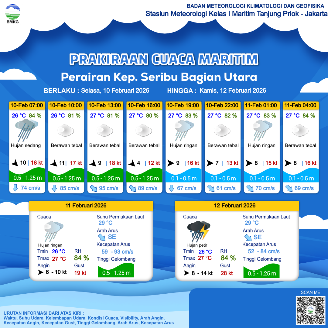10 Feb 26, 21.00 4 jam kedepan | Barat 8 kt Gust Peningkatan kecepatan angin yang singkat dan tiba-tiba : 16 kt | 0.5 m Rendah | Tenggara 69.0 cm/s | 27 °C | 84 % | |