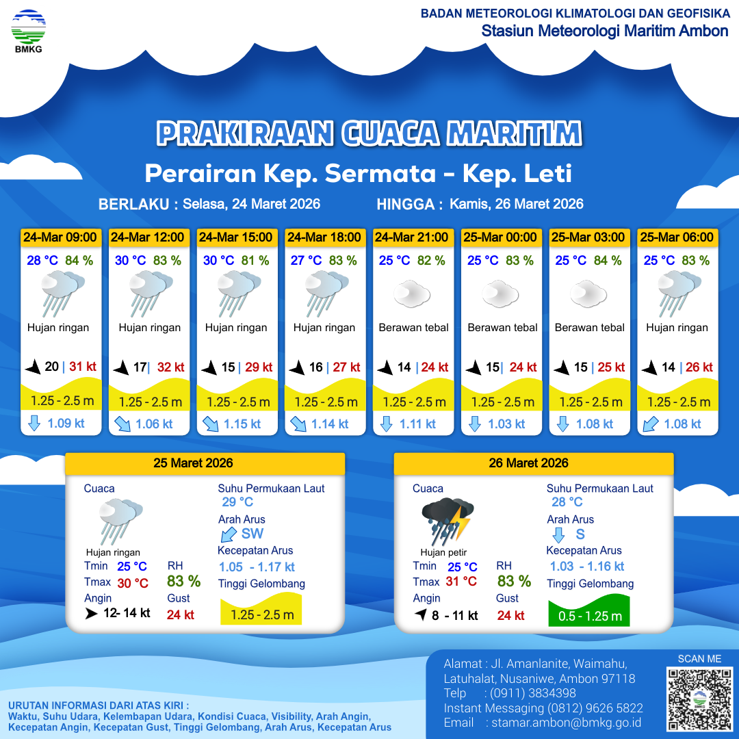 24 Mar 26, 16.00 16 jam kedepan | Barat Laut 15 kt Gust Peningkatan kecepatan angin yang singkat dan tiba-tiba : 25 kt | 1.5 m Sedang | Selatan 1.0 Knots | 25 °C | 83 % | |