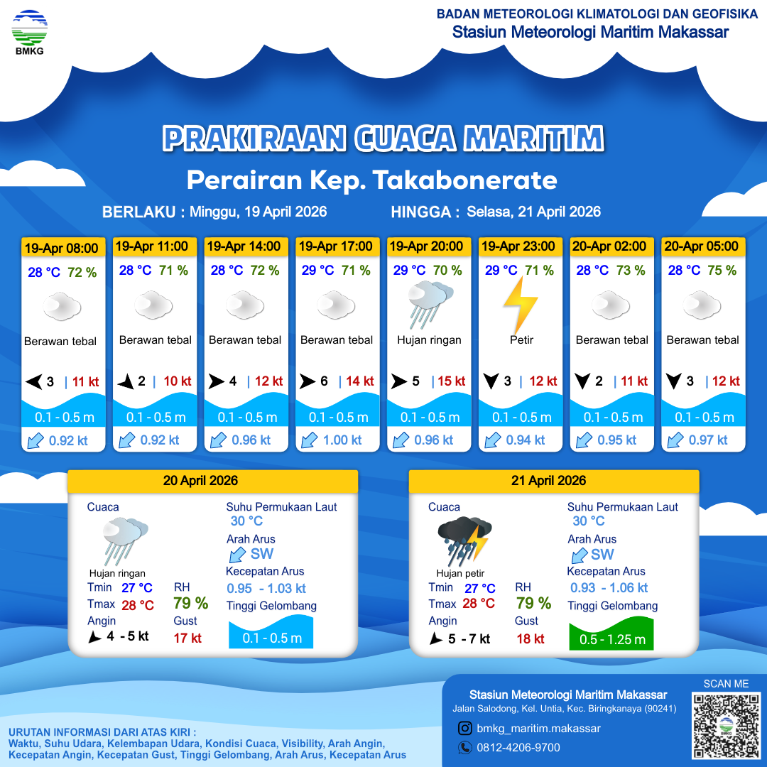 21 Apr 26, 00.00 18 jam kedepan | Timur Laut 6 kt Gust Peningkatan kecepatan angin yang singkat dan tiba-tiba : 12 kt | 0.5 m Rendah | Barat 1.0 Knots | 28 °C | 80 % | |
