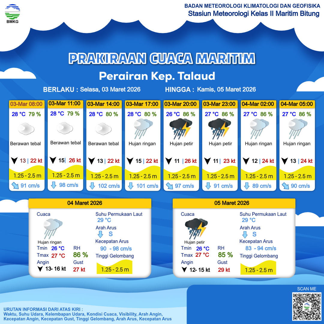 3 Mar 26, 02.00 4 jam kedepan | Utara 15 kt Gust Peningkatan kecepatan angin yang singkat dan tiba-tiba : 27 kt | 2.1 m Sedang | Selatan 96.0 cm/s | 28 °C | 79 % | |