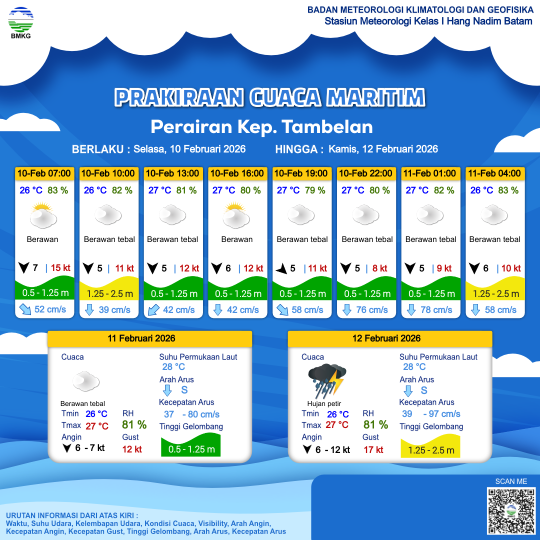10 Feb 26, 23.00 6 jam kedepan | Utara 6 kt Gust Peningkatan kecepatan angin yang singkat dan tiba-tiba : 11 kt | 1.2 m Rendah | Tenggara 49.0 cm/s | 26 °C | 84 % |