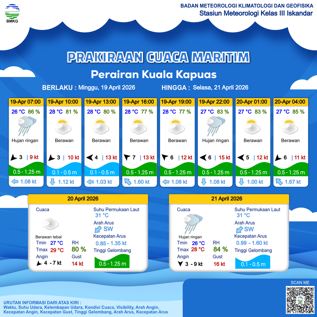 21 Apr 26, 06.00 24 jam kedepan | Barat Daya 4 kt Gust Peningkatan kecepatan angin yang singkat dan tiba-tiba : 11 kt | 0.3 m Tenang | Tenggara 1.0 Knots | 28 °C | 76 % | |