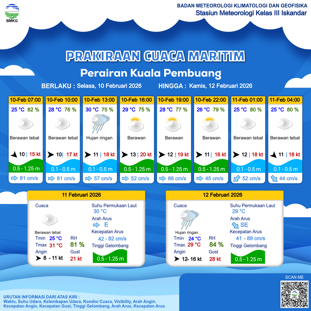10 Feb 26, 21.00 4 jam kedepan | Barat Laut 11 kt Gust Peningkatan kecepatan angin yang singkat dan tiba-tiba : 18 kt | 0.5 m Rendah | Tenggara 44.0 cm/s | 25 °C | 80 % | |