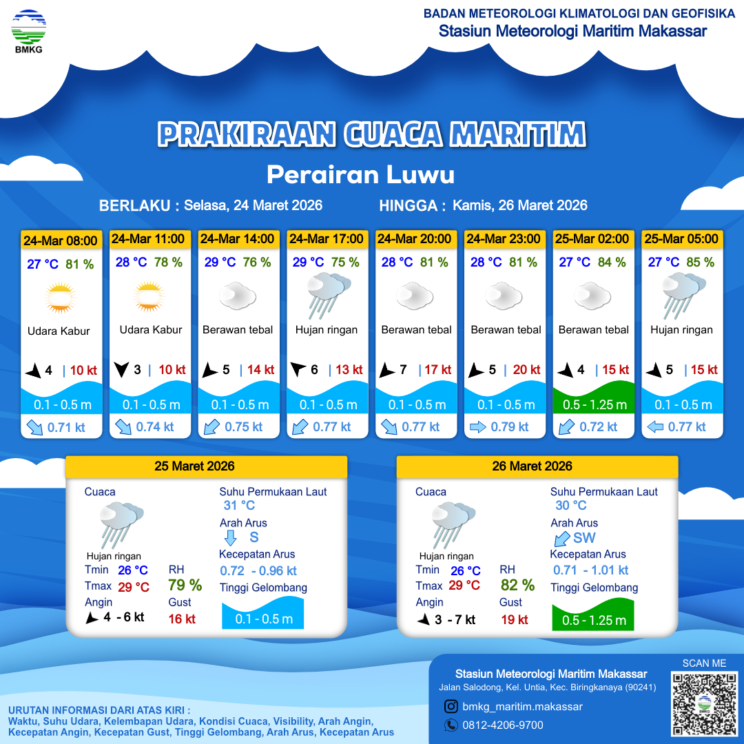 24 Mar 26, 02.00 2 jam kedepan | Utara 3 kt Gust Peningkatan kecepatan angin yang singkat dan tiba-tiba : 10 kt | 0.1 m Tenang | Timur 0.8 Knots | 28 °C | 79 % | |
