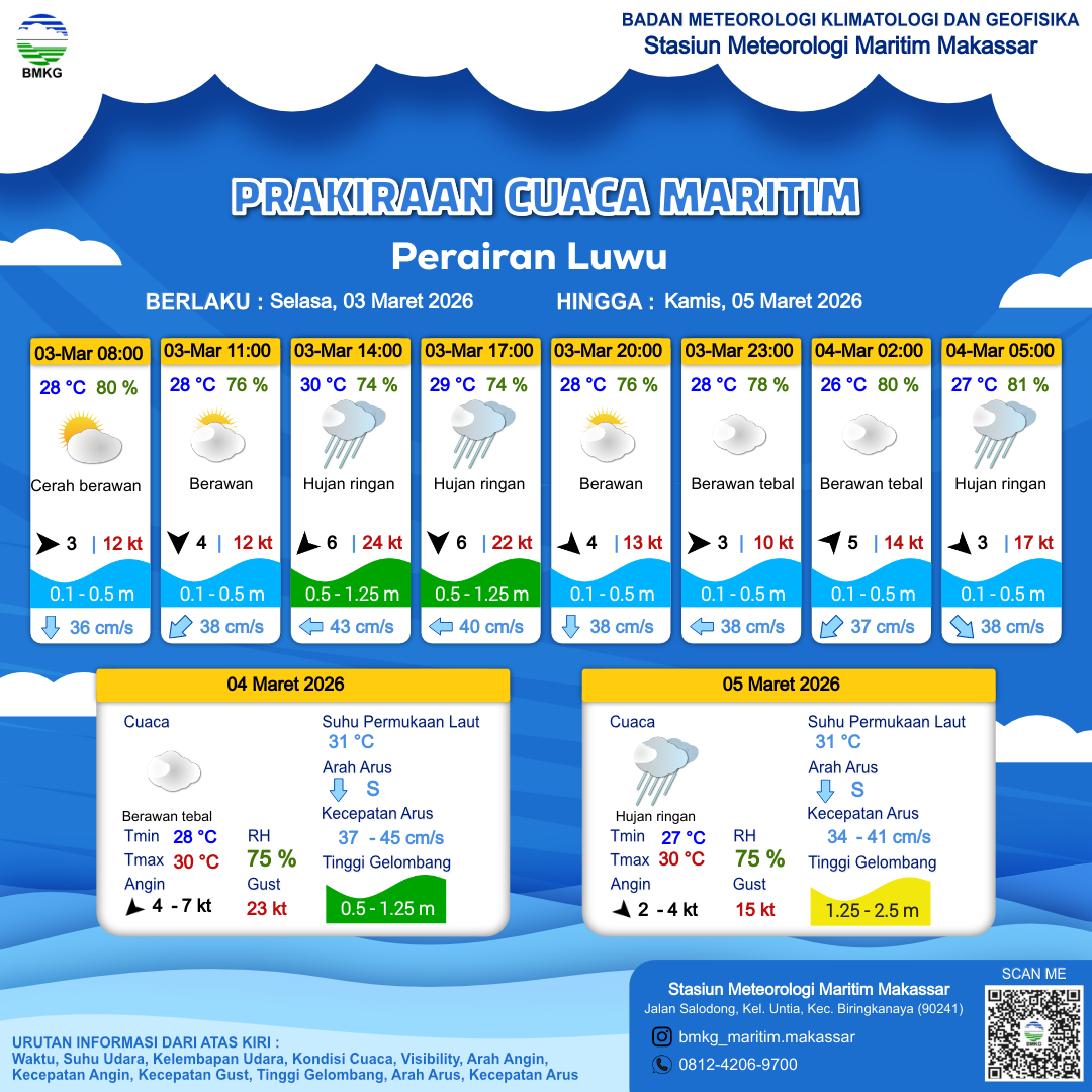 3 Mar 26, 00.00 2 jam kedepan | Barat 3 kt Gust Peningkatan kecepatan angin yang singkat dan tiba-tiba : 12 kt | 0.4 m Tenang | Selatan 36.0 cm/s | 28 °C | 80 % | |