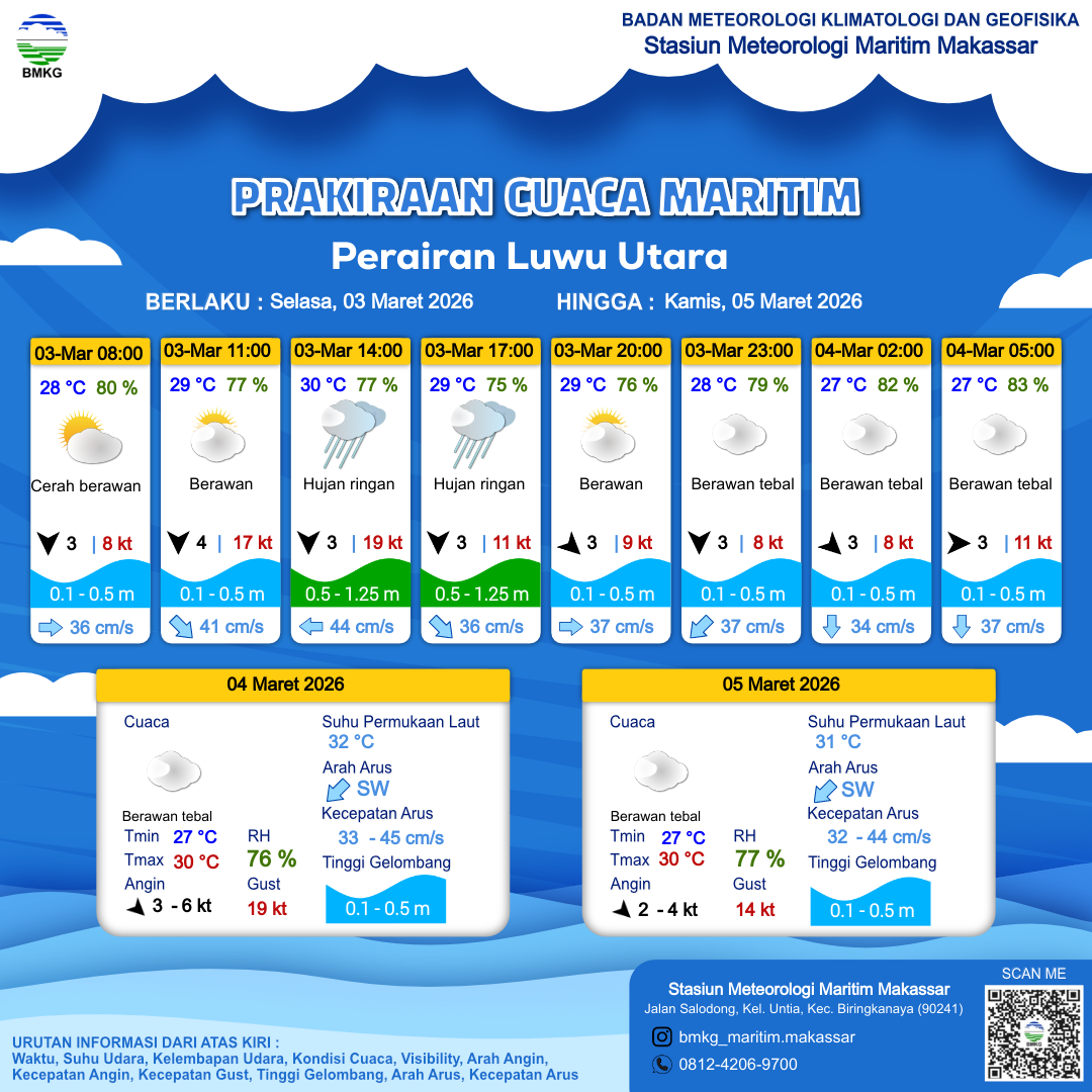 3 Mar 26, 00.00 2 jam kedepan | Utara 3 kt Gust Peningkatan kecepatan angin yang singkat dan tiba-tiba : 8 kt | 0.4 m Tenang | Timur 36.0 cm/s | 28 °C | 80 % | |