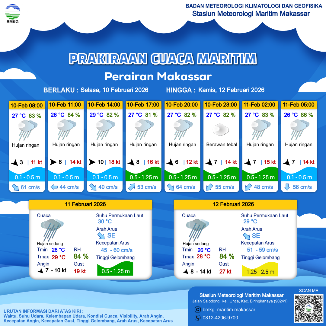 10 Feb 26, 23.00 6 jam kedepan | Barat Laut 8 kt Gust Peningkatan kecepatan angin yang singkat dan tiba-tiba : 14 kt | 0.5 m Rendah | Tenggara 60.0 cm/s | 26 °C | 85 % |
