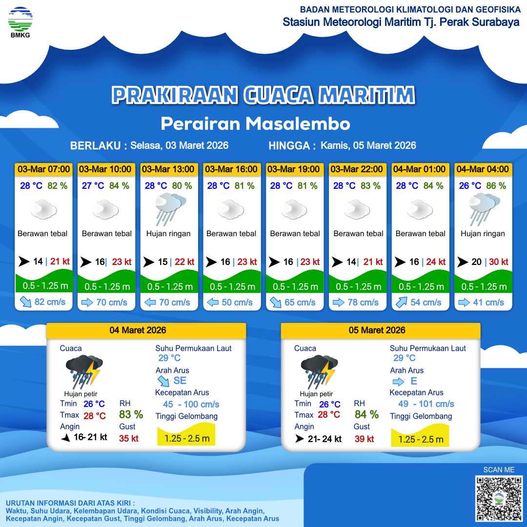 3 Mar 26, 10.00 12 jam kedepan | Barat 16 kt Gust Peningkatan kecepatan angin yang singkat dan tiba-tiba : 22 kt | 0.9 m Rendah | Selatan 38.0 cm/s | 28 °C | 80 % | |