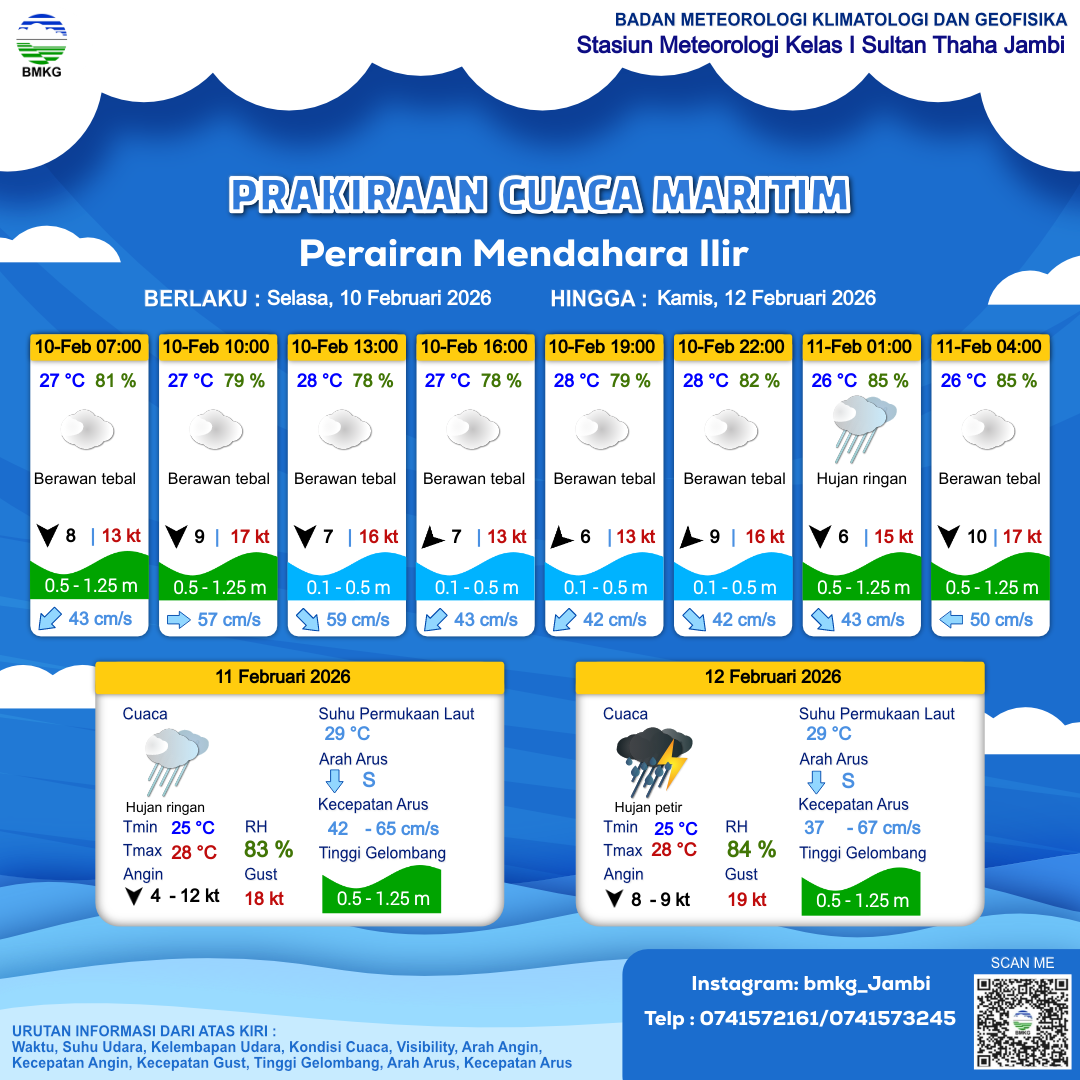 10 Feb 26, 19.00 2 jam kedepan | Utara 6 kt Gust Peningkatan kecepatan angin yang singkat dan tiba-tiba : 14 kt | 0.7 m Rendah | Selatan 39.0 cm/s | 26 °C | 85 % | |