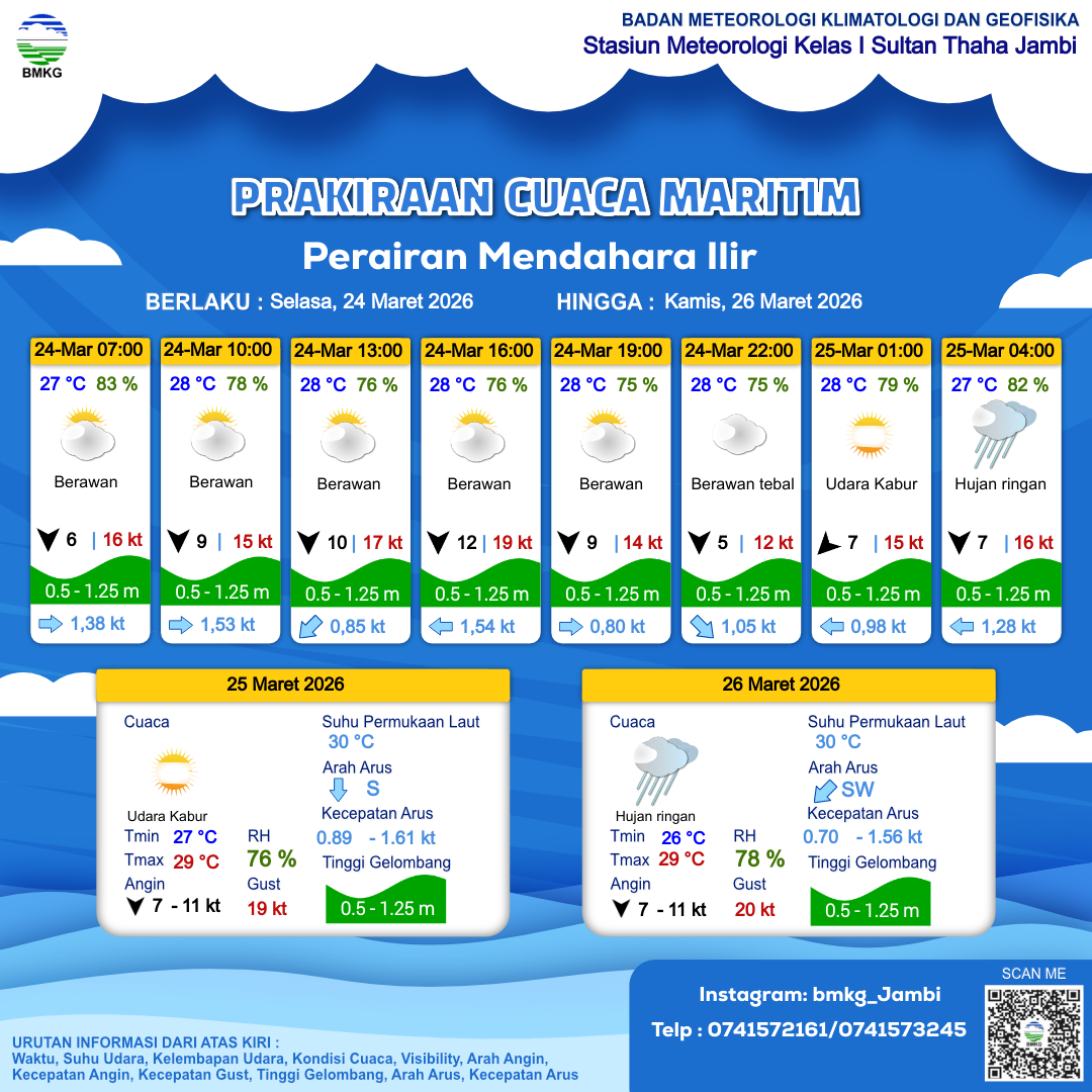 24 Mar 26, 08.00 8 jam kedepan | Utara 12 kt Gust Peningkatan kecepatan angin yang singkat dan tiba-tiba : 19 kt | 0.7 m Rendah | Barat 1.5 Knots | 28 °C | 76 % | |