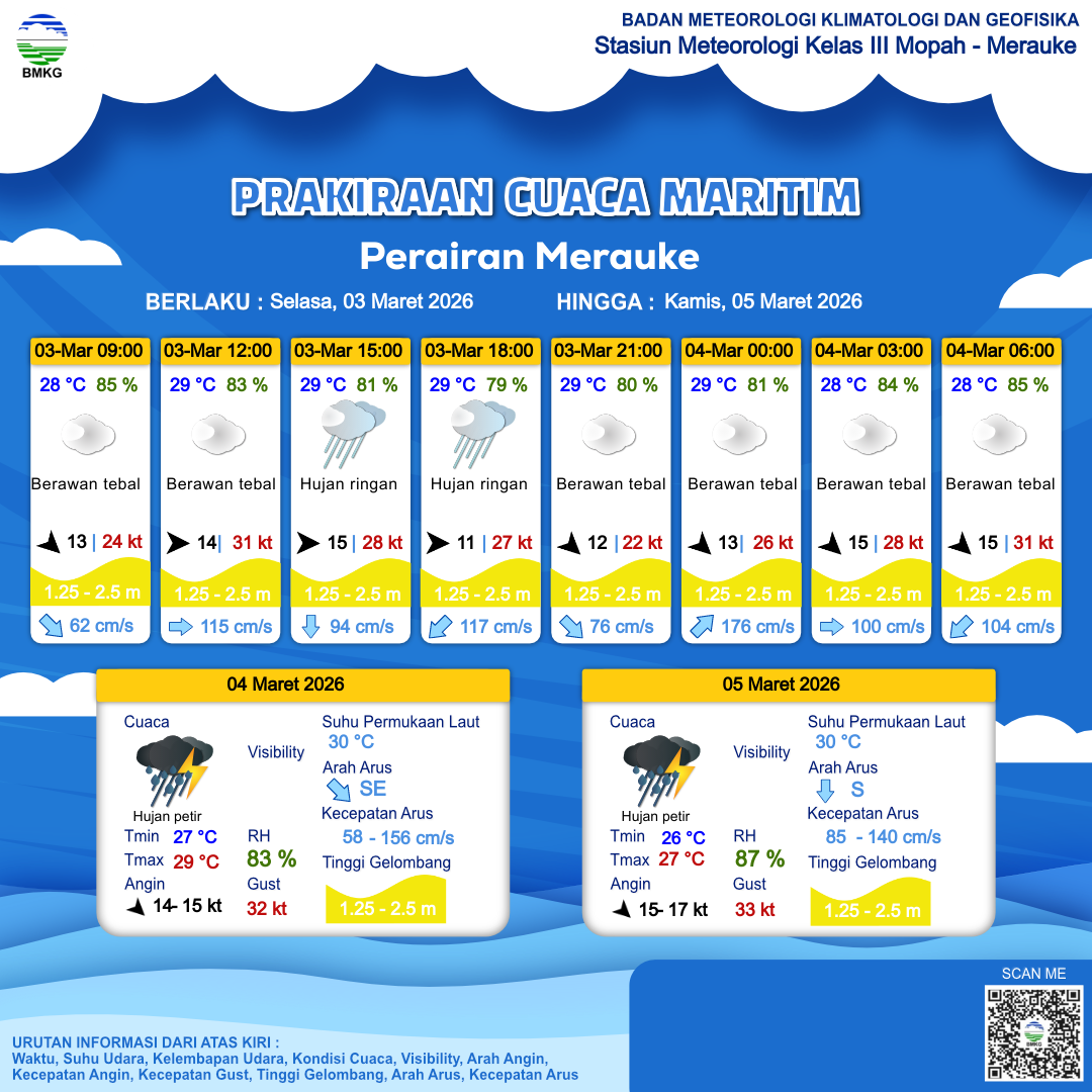 3 Mar 26, 06.00 8 jam kedepan | Barat 15 kt Gust Peningkatan kecepatan angin yang singkat dan tiba-tiba : 28 kt | 1.4 m Sedang | Selatan 94.0 cm/s | 29 °C | 81 % | |