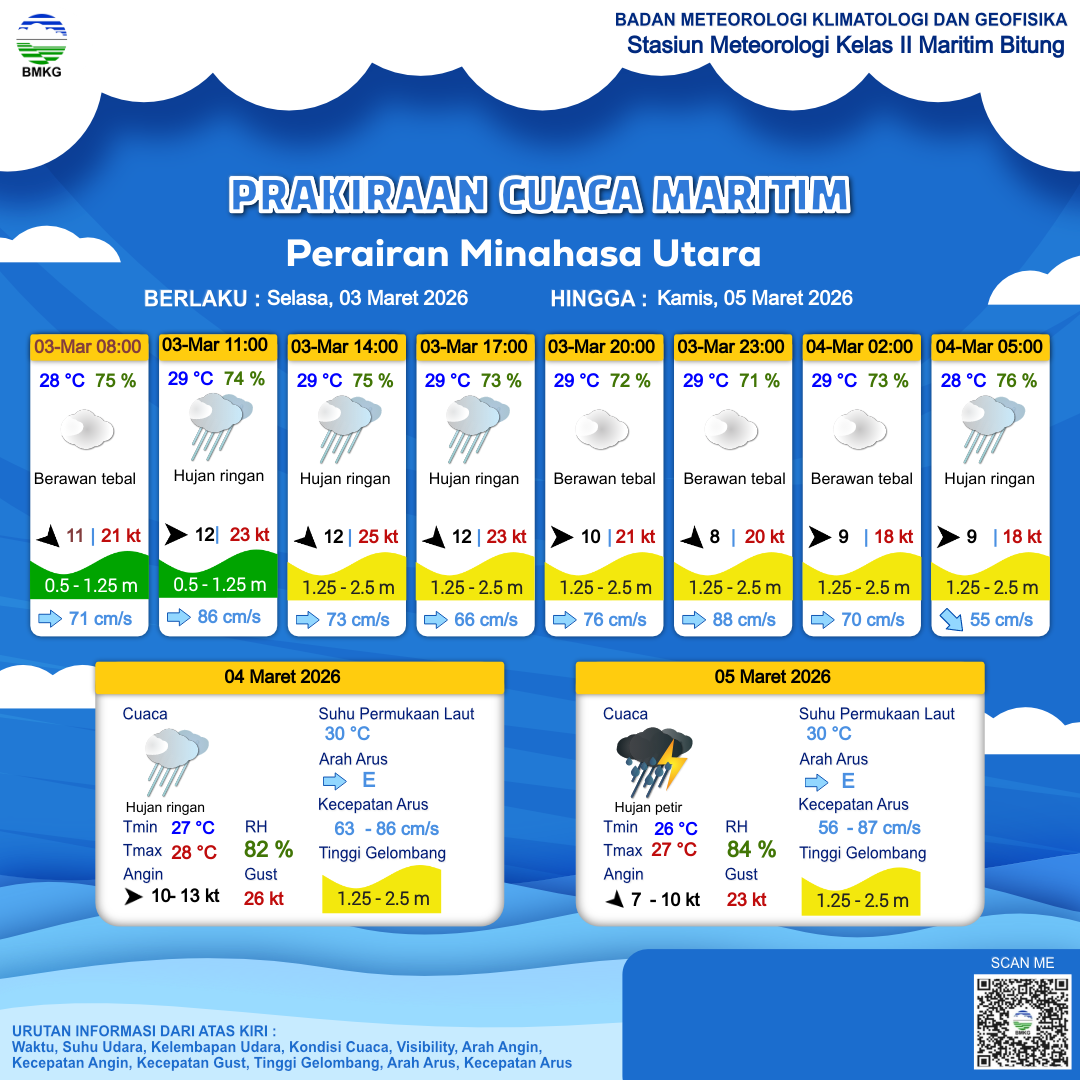 3 Mar 26, 04.00 6 jam kedepan | Barat 12 kt Gust Peningkatan kecepatan angin yang singkat dan tiba-tiba : 25 kt | 1.3 m Sedang | Timur 83.0 cm/s | 29 °C | 75 % | |