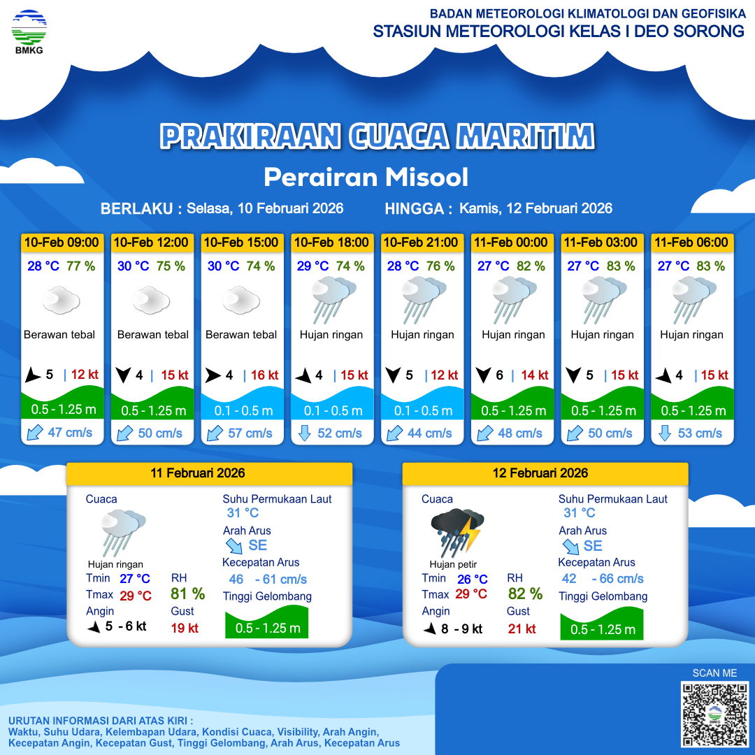 10 Feb 26, 19.00 3 jam kedepan | Utara 5 kt Gust Peningkatan kecepatan angin yang singkat dan tiba-tiba : 14 kt | 0.9 m Rendah | Selatan 52.0 cm/s | 27 °C | 83 % | |