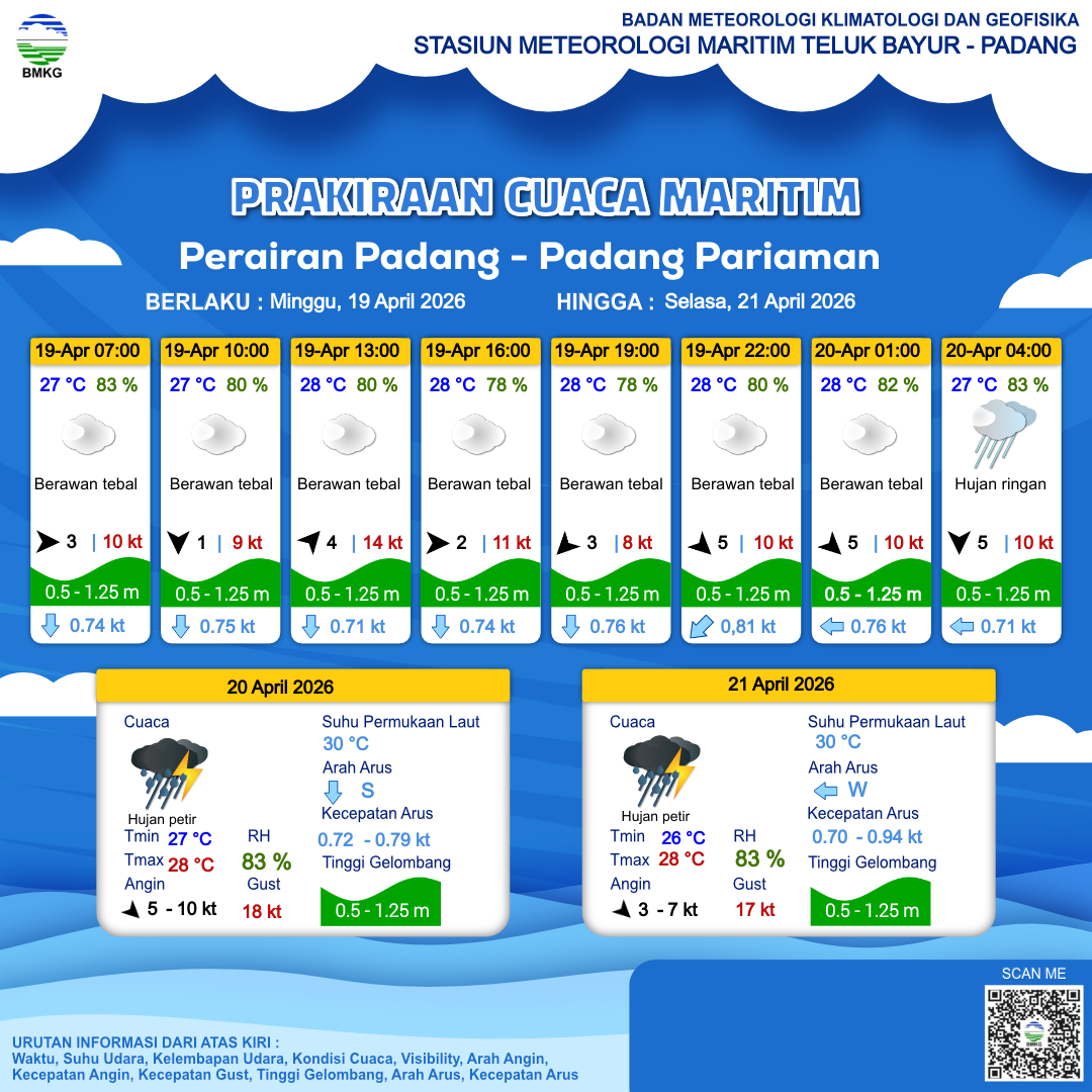 19 Apr 26, 06.00 1 hari 1 jam yang lalu | Barat Daya 4 kt Gust Peningkatan kecepatan angin yang singkat dan tiba-tiba : 14 kt | 0.8 m Rendah | Selatan 0.7 Knots | 28 °C | 80 % | |